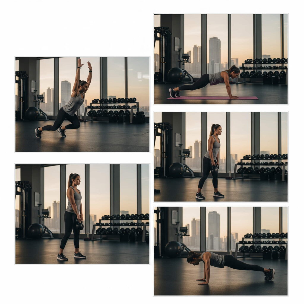 - Miércoles: Fuerza (cuerpo completo + core)